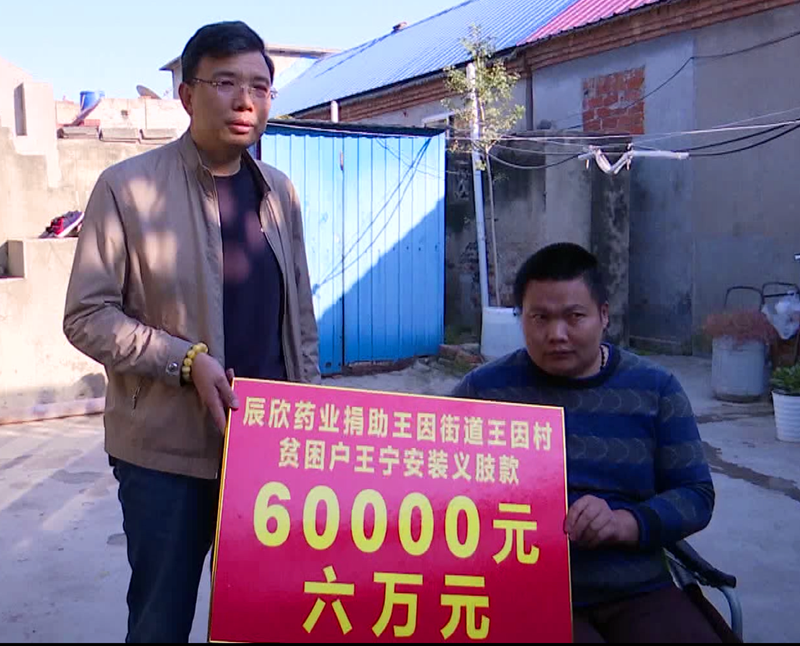 2018年10月16日,辰欣藥業綜合部部長李峰受董事長杜振新的委托,在王因街道居委會劉梅主任的陪同下前往了王寧家中,為王寧一家送去安裝雙義肢及康復訓練的愛心捐助金60000元,為這一家人送去了對美好生活的憧憬。