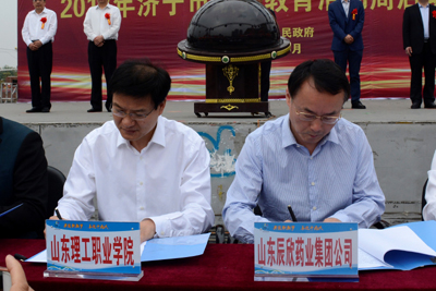 5月8日,為推動全市積極探索現代職業教育改革,濟寧市“職業教育活動周”啟動儀式在濟寧市文化廣場舉行。辰欣藥業股份有限公司杜振新董事長與山東理工職業學院孫琪院長共同簽訂《共建“辰欣學院”》協議。
